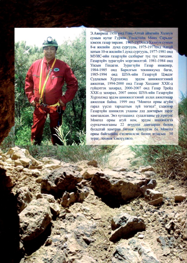 ШУА-ийн Газарзүйн хүрээлэнгийн Физик газарзүйн секторын эрдэм шинжилгээний тэргүүлэх ажилтан доктор (Ph.D) Эрдэнэдалайн Авирмэд «Агуй» хэмээх ганц сэдэвт зохиол хэвлүүлж олны хүртээл болгож байна.Энэхүү бүтээлийг академич О.Төмөртогоо нар шүүн тунгаажээ. Зохиогч агуй болон түүний доторх бүрэлдэлийн тухай өөрийн сүүлийн 20 гаруй жилийн агуйн судалгааны материалд тулгуурлан бичжээ. Зохиогч номондоо монгол орны агуйд бүрэлдэн бий болсон агуйн бүрэлдэлүүдийг дэлхийн зарим агуйд бүрэлдэн бий болсон агуйн бүрэлдэлтэй харьцуулан судалж унжуу, ургуу бана, агуйн шүр, хөшигөн бана, гахайн махан бана, арганит, агуйн эрдэнэ шиш, гипсэн цэцэг,бамбай, тавцан чулуу, мушгиас, чулуун цэцэг, чулуун хүрхрээ зэрэг 30-аад хурдас чулуулгийг олж бүртгэн оруулжээ. Оксфордын их сургуультай хамтран говийн агуйн 10 спелеотемийн насыг U-Th аргаар тогтоосон нь Монголын говь цөлд сүүлийн 550 000 жилийн туршид тасралтгүй үргэлжилсэн ус чийг багатай хуурай халуун нөхцөлтэй байсныг тогтоосон ба энэ нь спелеотемийн ургалт зогссон байдал, спелеотемийн насаар батлагдаж байгаа юм.